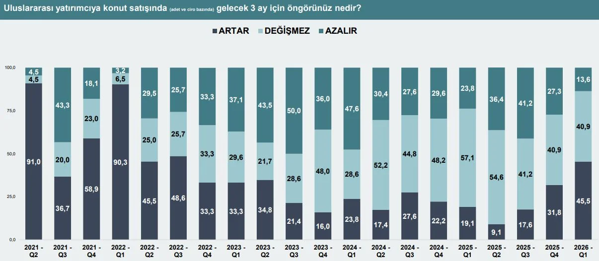 2026 yılının ilk çeyreğini kapsayan çalışmaya göre GİGDER üyelerinin %40,9’u, gelecek 3 ayda uluslararası yatırımcılara yönelik konut satışlarında belirgin bir değişim beklemediklerini aktardı. Satışlarda artış bekleyenlerin oranı %45,5’e yükselirken düşüş öngörenlerin oranı %13,6 olarak kaydedildi.