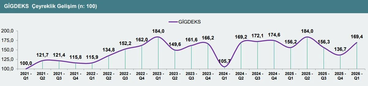 GİGDEKS 20 verilerine göre bir önceki çeyrekte 136,7 olan GİGDEKS baz puanı, 2026 yılının ilk çeyreğinde 169,4’e yükseldi.